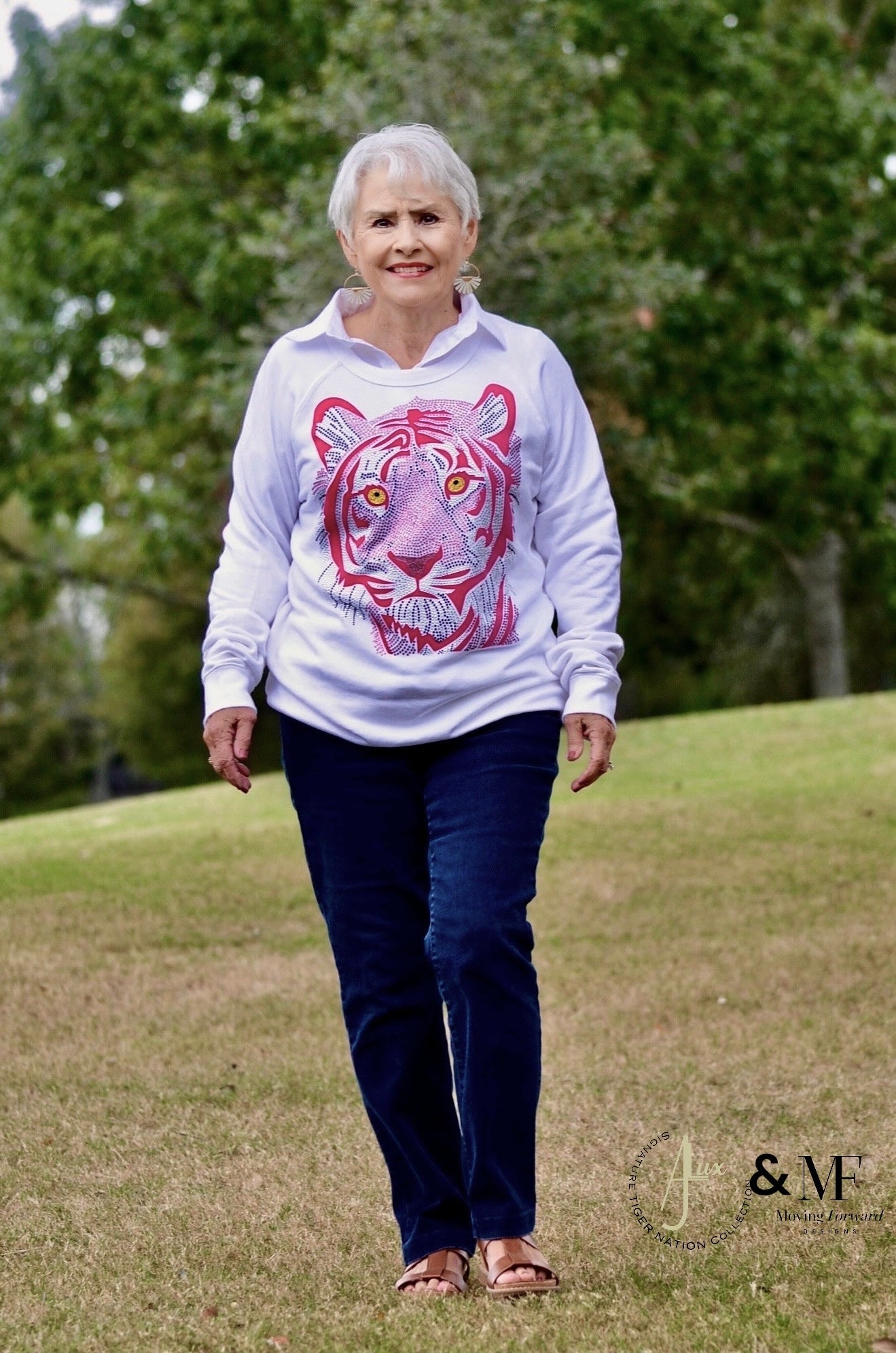 Our Signature Tiger Nation Crewneck Sweatshirt showcases our iconic Velvet in Pink with a Pink and Gold Crystal Tiger Face. This soft fleece piece combines timeless style with unbeatable comfort, making it perfect for layering over a tank or wearing on its own. Elevate any outfit with this stylish and cozy addition to your wardrobe.